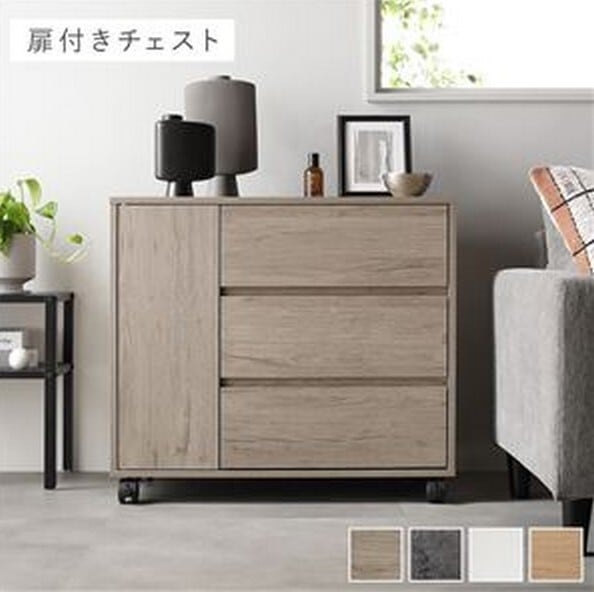 ◆キャスター付き 収納〔 扉付きチェスト 約幅75×奥行39×高さ66.7cm グレージュ 〕 取っ手付き タンス 収納家具