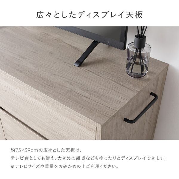 約75×39cmの広々とした天板は、テレビ台としても使え、大きめの雑貨などもゆったりとディスプレイできます。