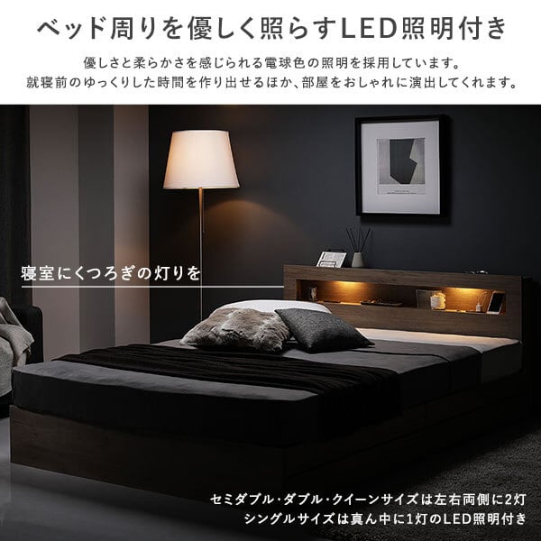 セミダブル・ダブル・クイーンサイズは左右両側に2灯、シングルサイズは真ん中に1灯のLED照明付き
